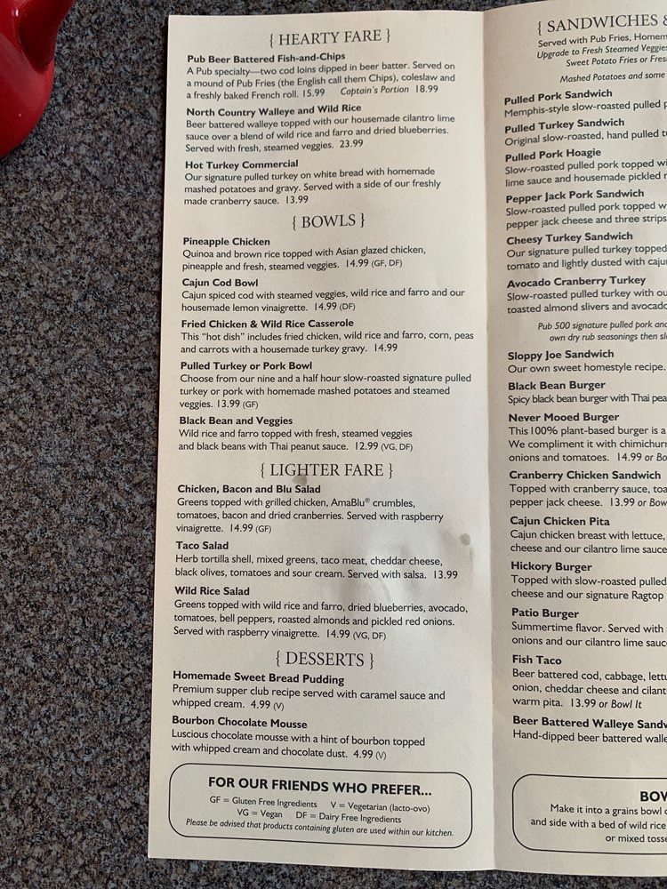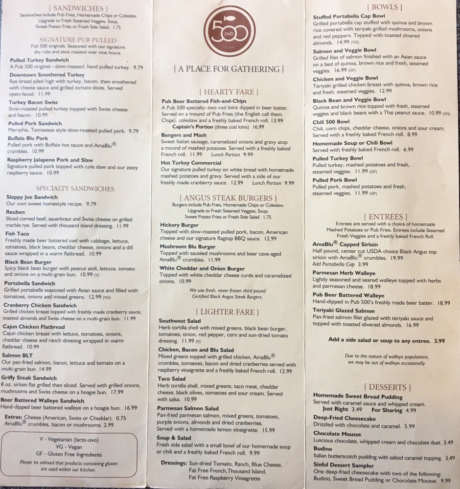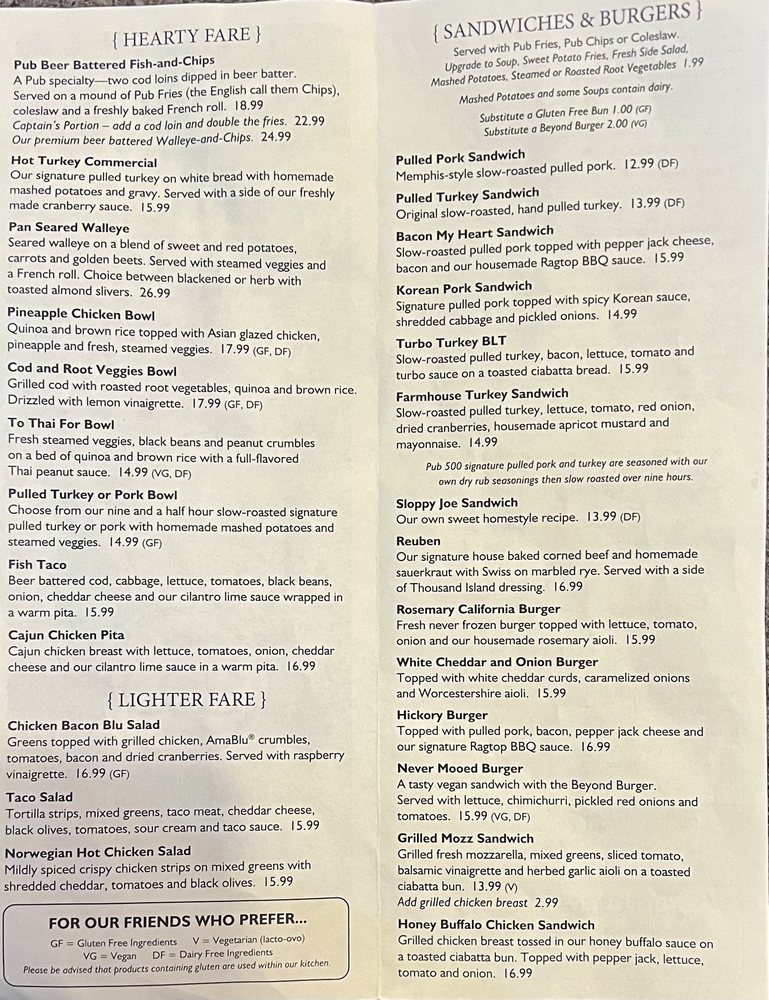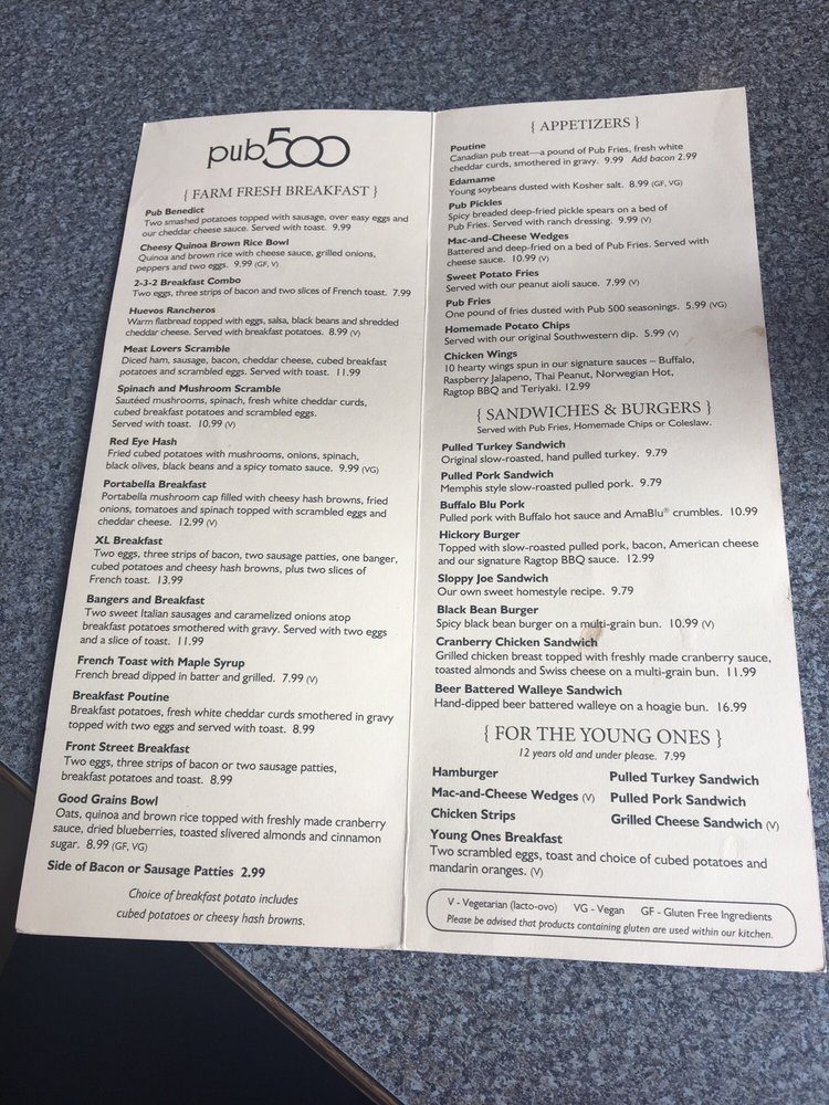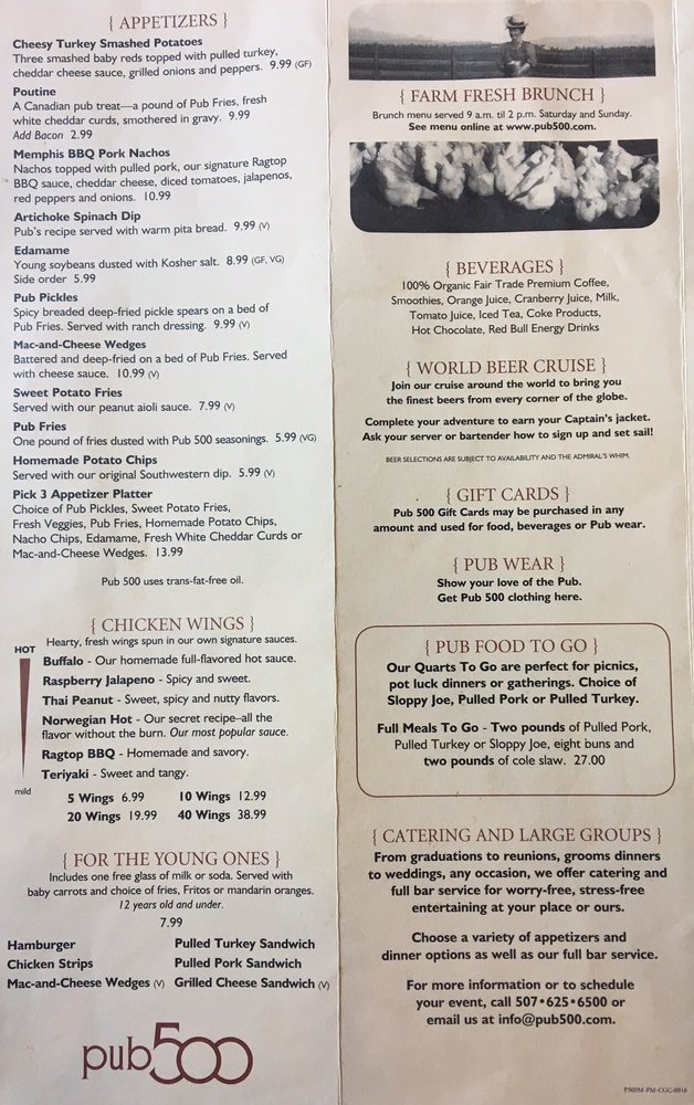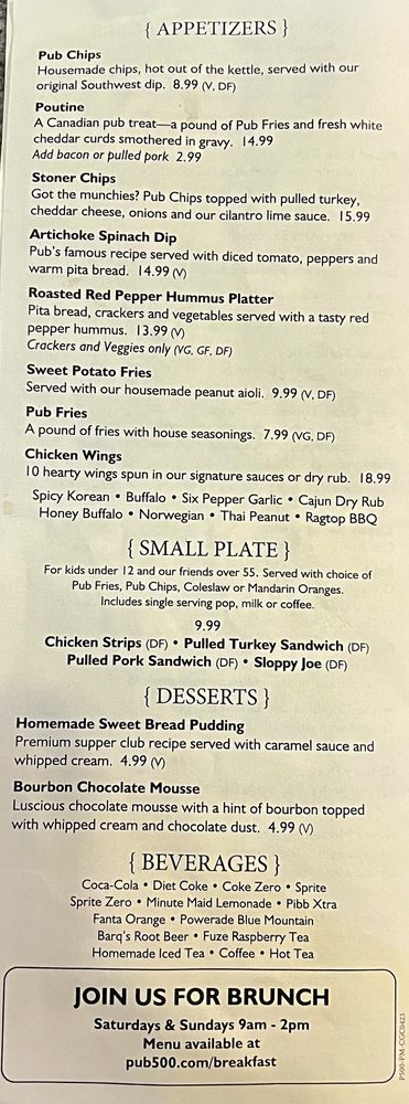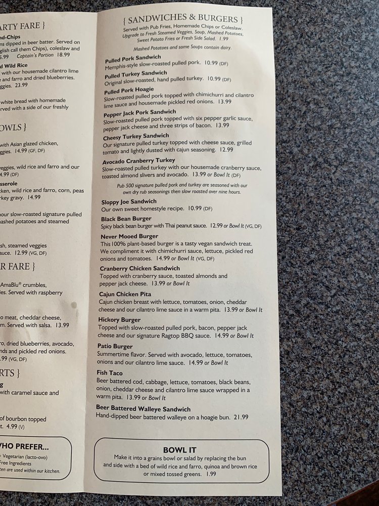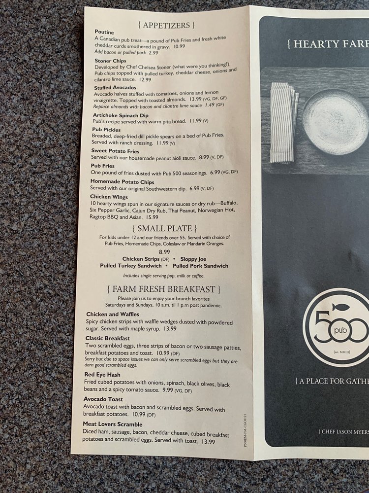 Pub 500, located in Mankato, MN, offers a diverse menu of pub favorites with a unique twist. With a wide range of options, including vegan and vegetarian choices, this pub is sure to satisfy any craving. From their famous cheese curds and poutine to their creative sandwiches and burgers, such as the Hot Honey Chicken Sandwich and Never Mooed Burger, the menu is full of flavorful delights. The hearty fare options like the Pub Beer Battered Fish-and-Chips and Seared Walleye showcase their commitment to quality ingredients and delicious combinations. The reviews from customers praise both the food and the attentive service, making Pub 500 a top choice for a satisfying meal. Whether you're looking for a casual bite or a night out with friends, Pub 500 has something for everyone.